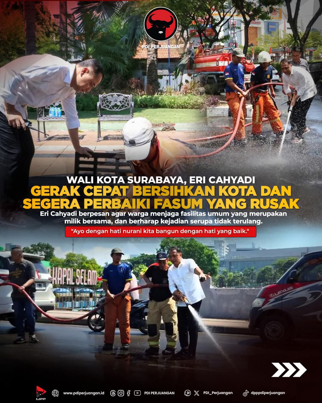 “Tidak ada yang berniat membuat Surabaya jelek. Semuanya ingin yang terbaik untuk Surabaya dan untuk Indonesia. Maka, ayo dengan hati nurani kita bangun dengan hati yang baik,” tegas Eri.